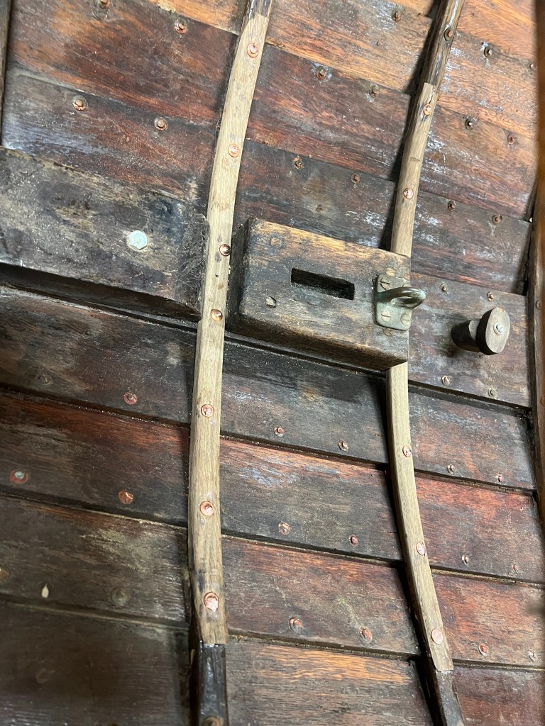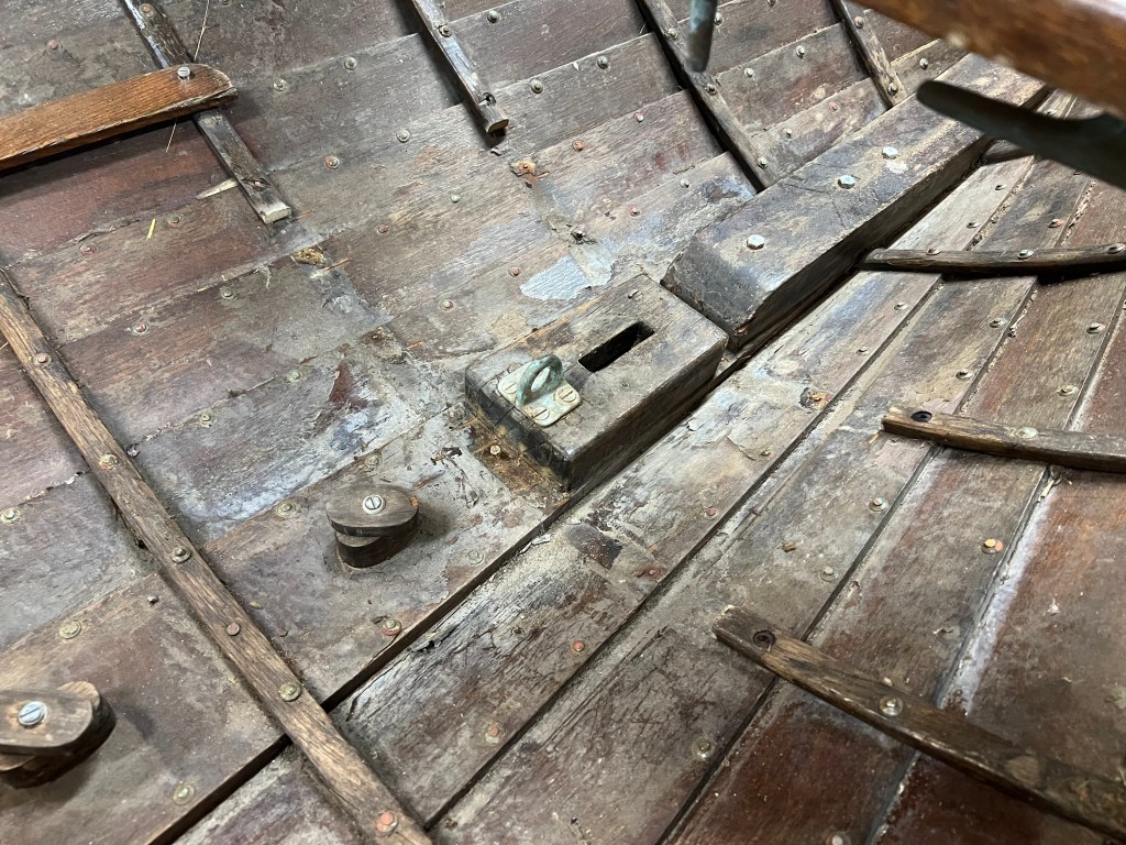 Another odd feature of this little boat was the shape of her midships section in relation to her keel depth that meant the lands of the lower planks would ground before the bilge keels – as can be seen in the picture above where I’ve laid a straight edge across her bottom roughly amidships, exactly where she would take the ground.