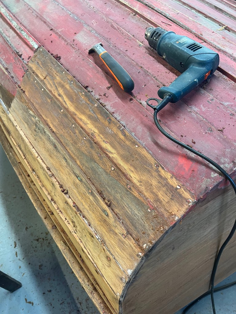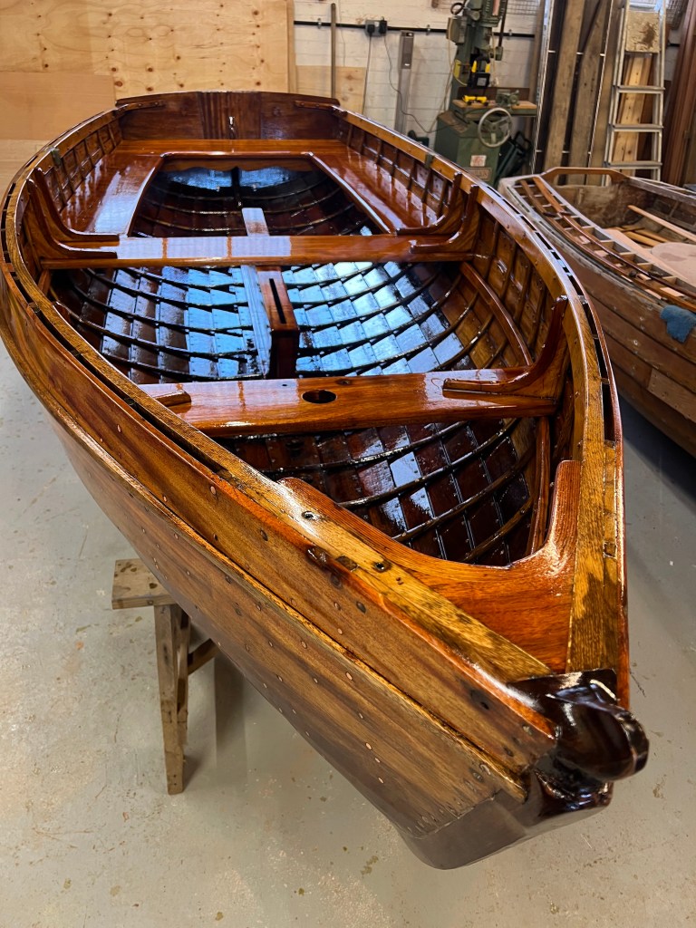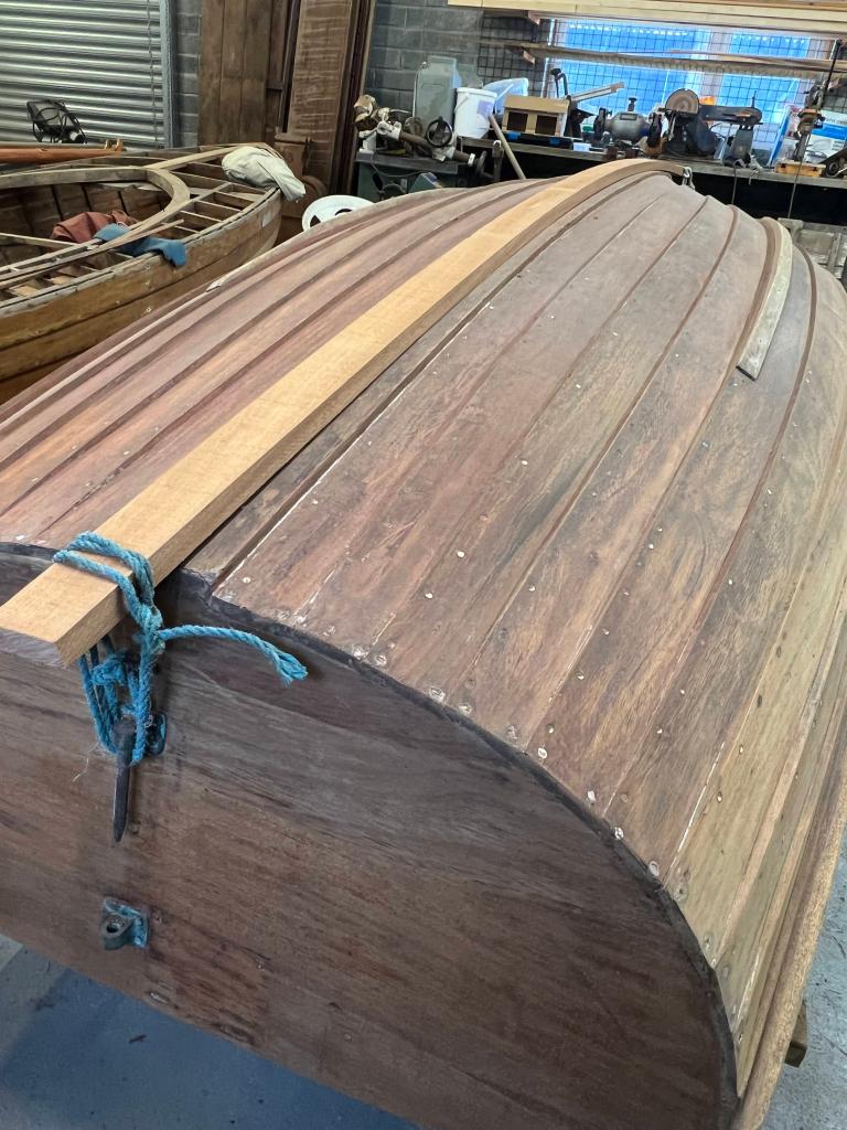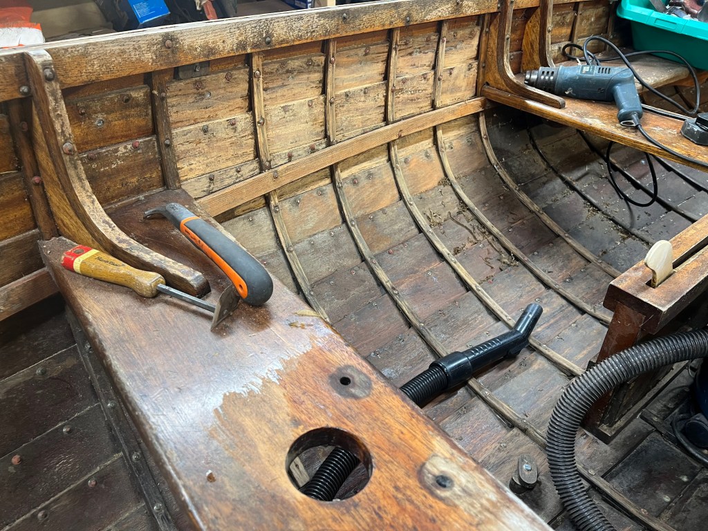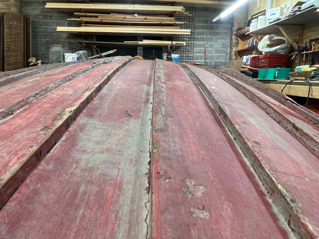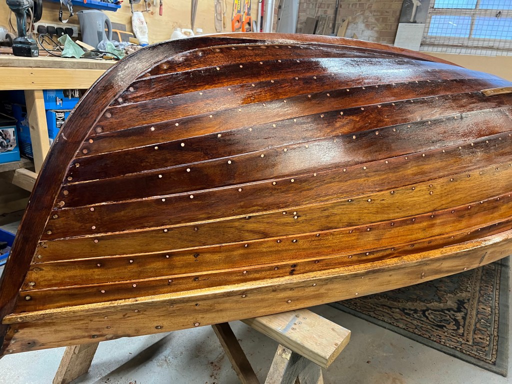 The boat was assessed and only needed minor repairs, namely the repair of three or four sections of new frames (ribs) a complete strip down of as much interior varnish and cleanup and a strip of the exterior and return to a bright finish. She was painted with what looked like red antifouling paint below the waterline.