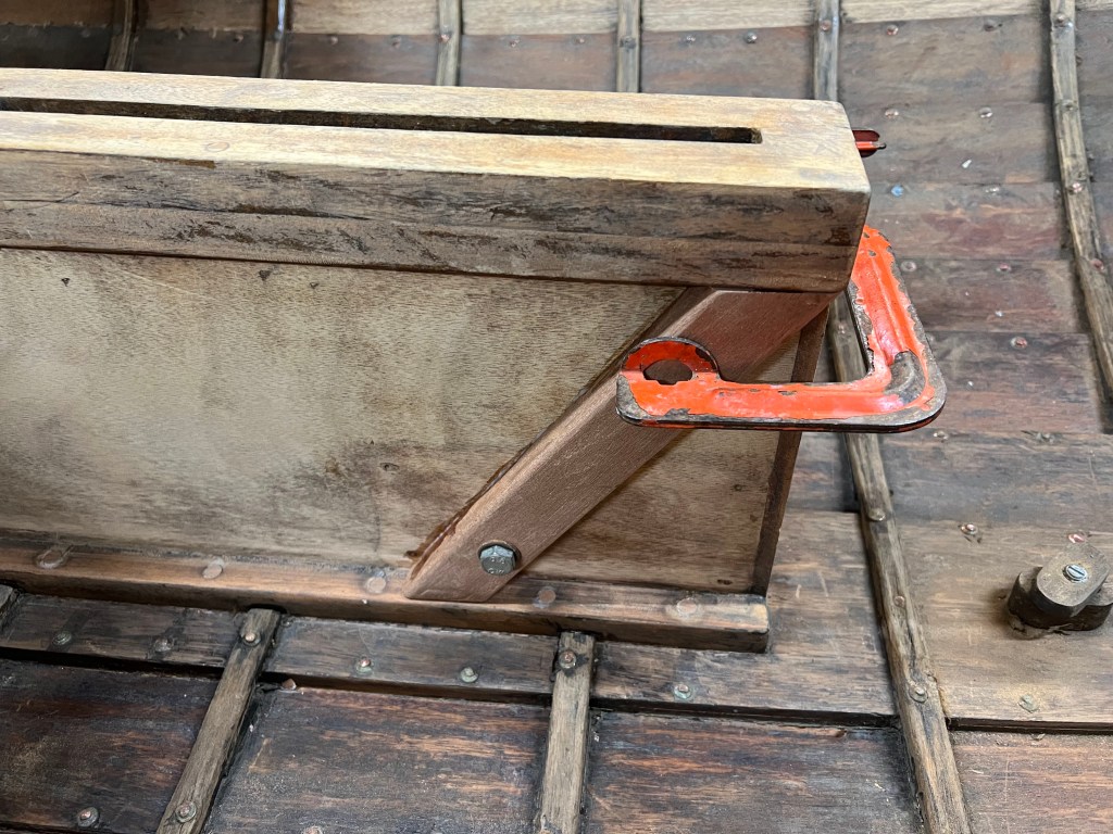 The centre plate had a strange arrangement with a pin buried behind two wooden patches and had clearly been leaking. This was stripped away and two diagonals fabricated and glued over the pivot bolt hole as shown to provide a strong landing for the bolt. The centre plate case has thin plywood sides and these doublers will strengthen this area considerably.
