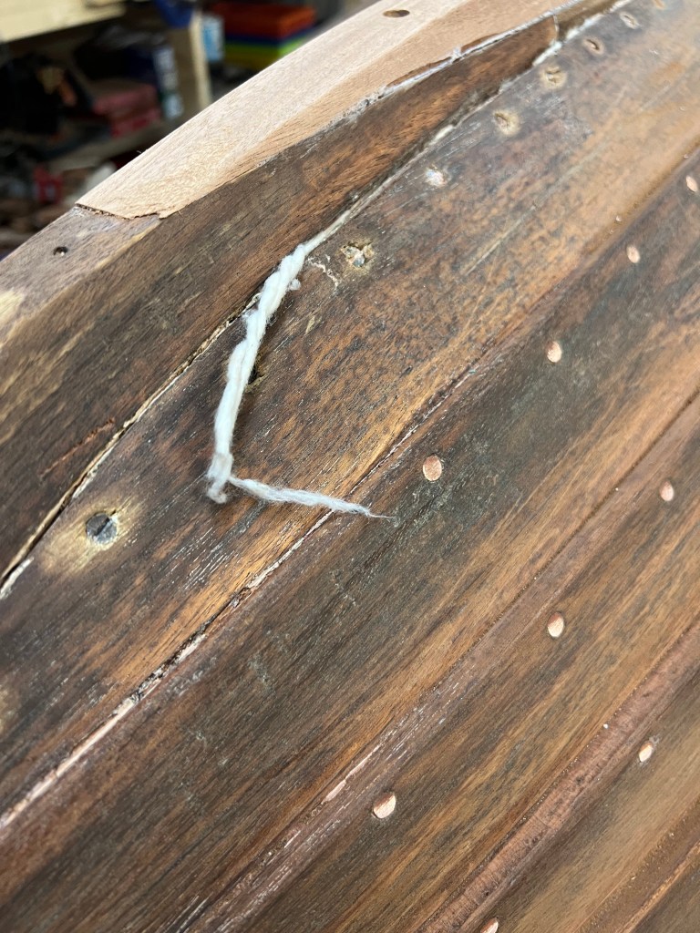 The final task was to rake out a few of the open garboard seams and drive in some fresh cotton. Her seams are so narrow that in places only one strand of cotton was needed.