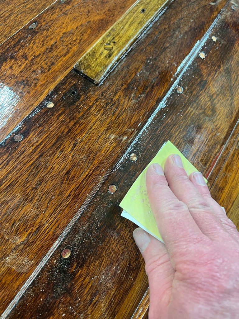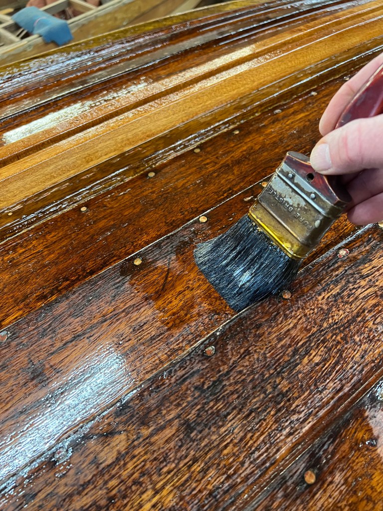 After caulking, various small holes and seams were plugged, filled and faired and then there followed more scraping and sanding till I was happy the outer planking was as smooth and tidy. I’ve made no effort to bleach any of the staining or darkened wood – I’m happy that she’ll have a bit of a patina of age and a few scars from her previous life. Varnishing was next.