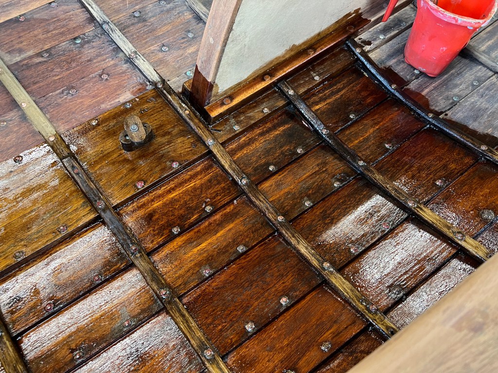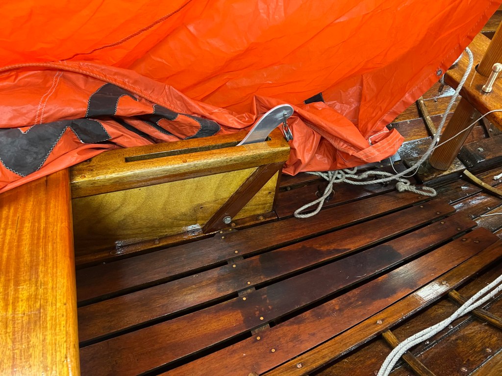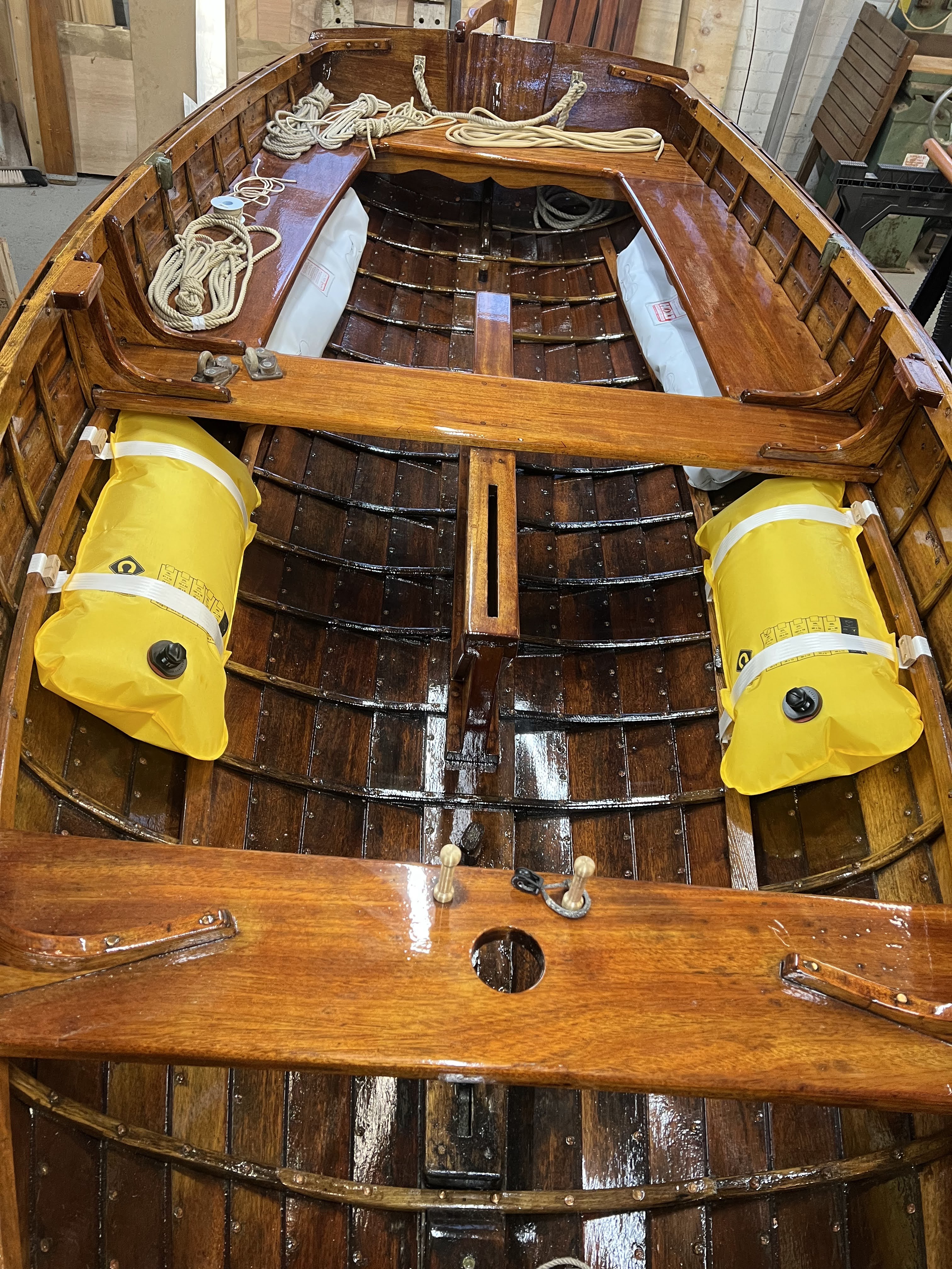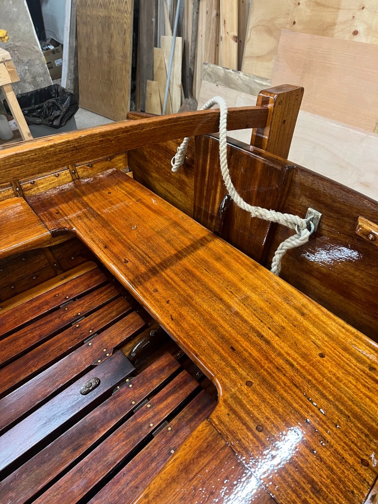 With the varnish now hardening it was time to start to put her back together again. The floorboards (burden boards) had been sanded and separately varnished and were refitted. The rudder was re-hung and sheet bridle plates and chain plates refitted.
