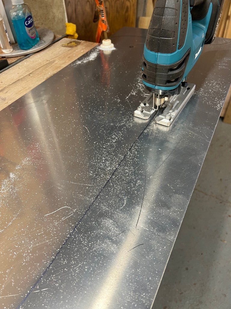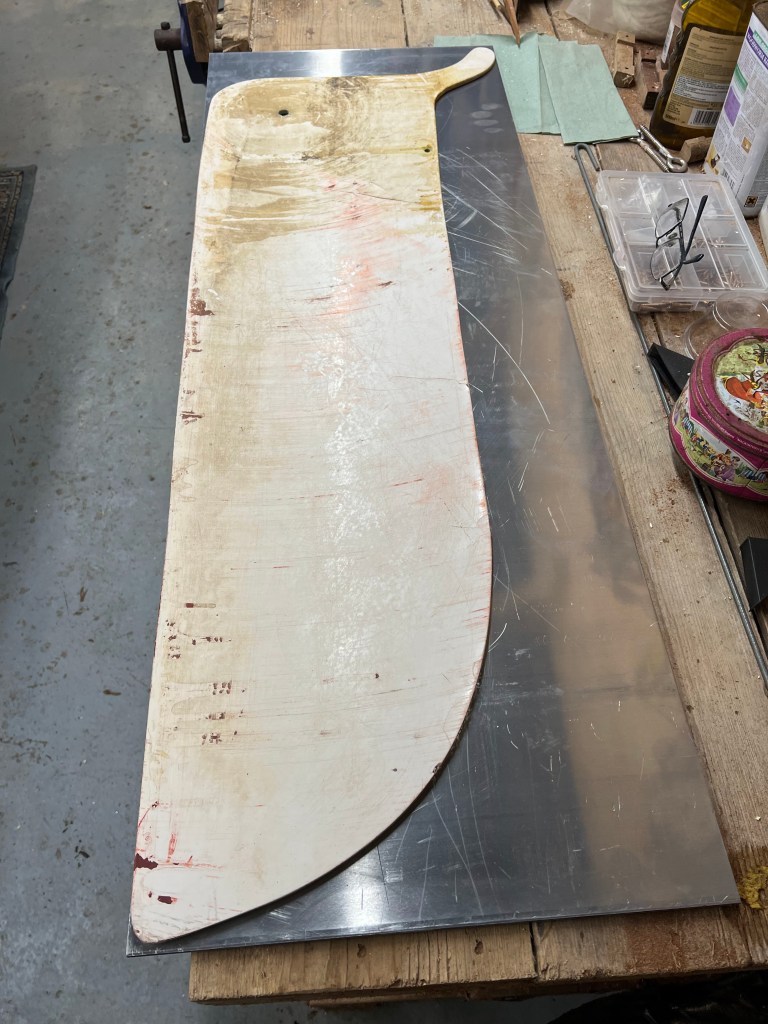 Attention was then turned to the centreboard. As found she was fitted with a 6mm thick flat g.r.p. centreboard that was very flexible and was breaking up. The slot and c/b case is only made for a thin centre plate and so I decided to give her a metal centre plate. A marine-grade aluminium alloy was chosen of the same thickness and I simply used the old ‘plate as a template. Cut out using a coarse hacksaw blade in the jigsaw and filed all around to fit.