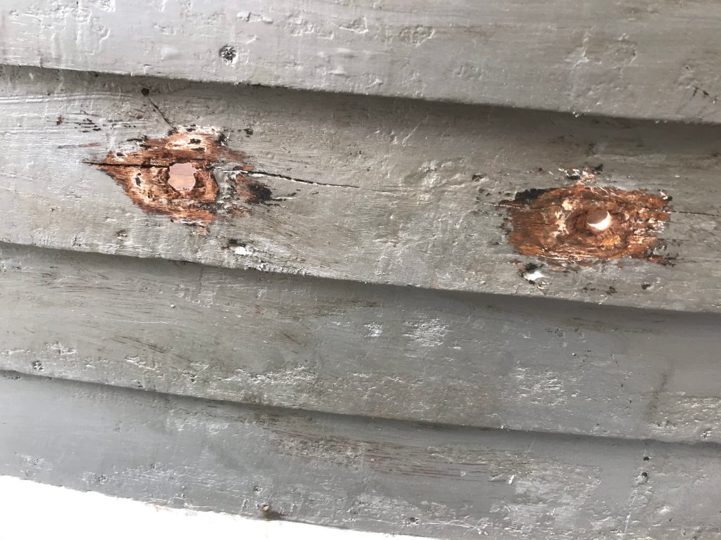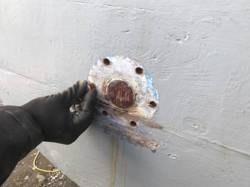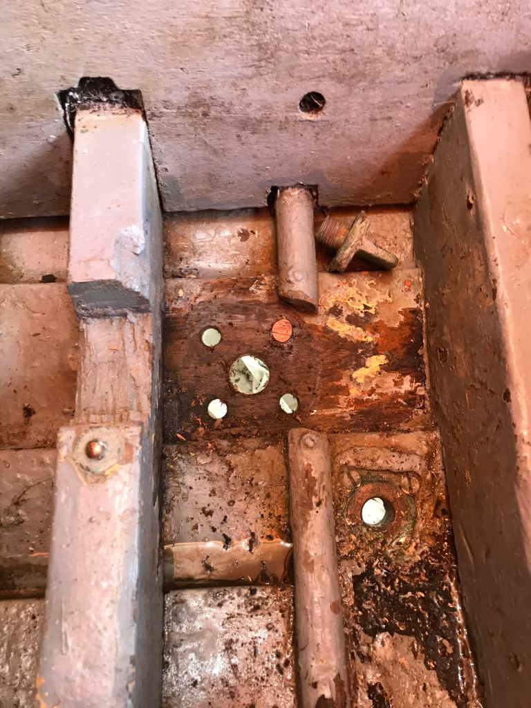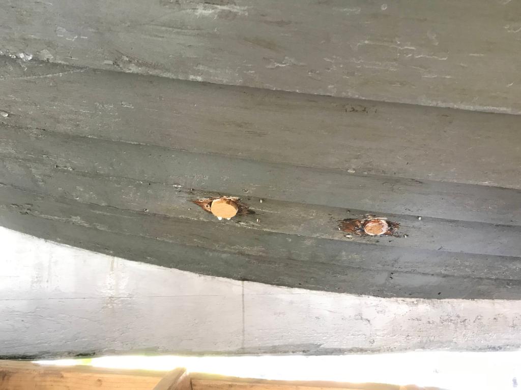 The broken frames were marked, cut and removed after grinding off the rove heads and driving out the nails. All the copper fastenings are sound even after 80-years.