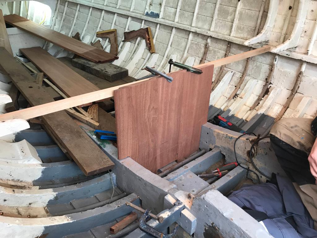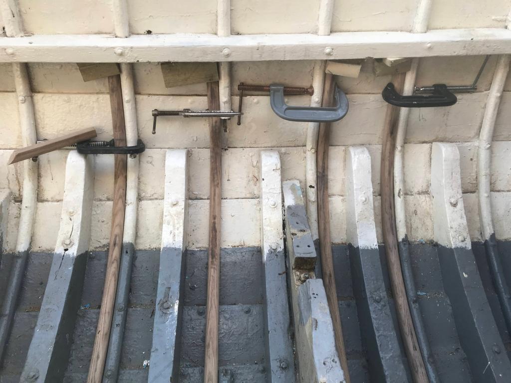 The sections of new timber were given about 40-50 minutes in the steam box and were bent into place alongside the frames they were to replace and clamped and allowed to cool and dry.