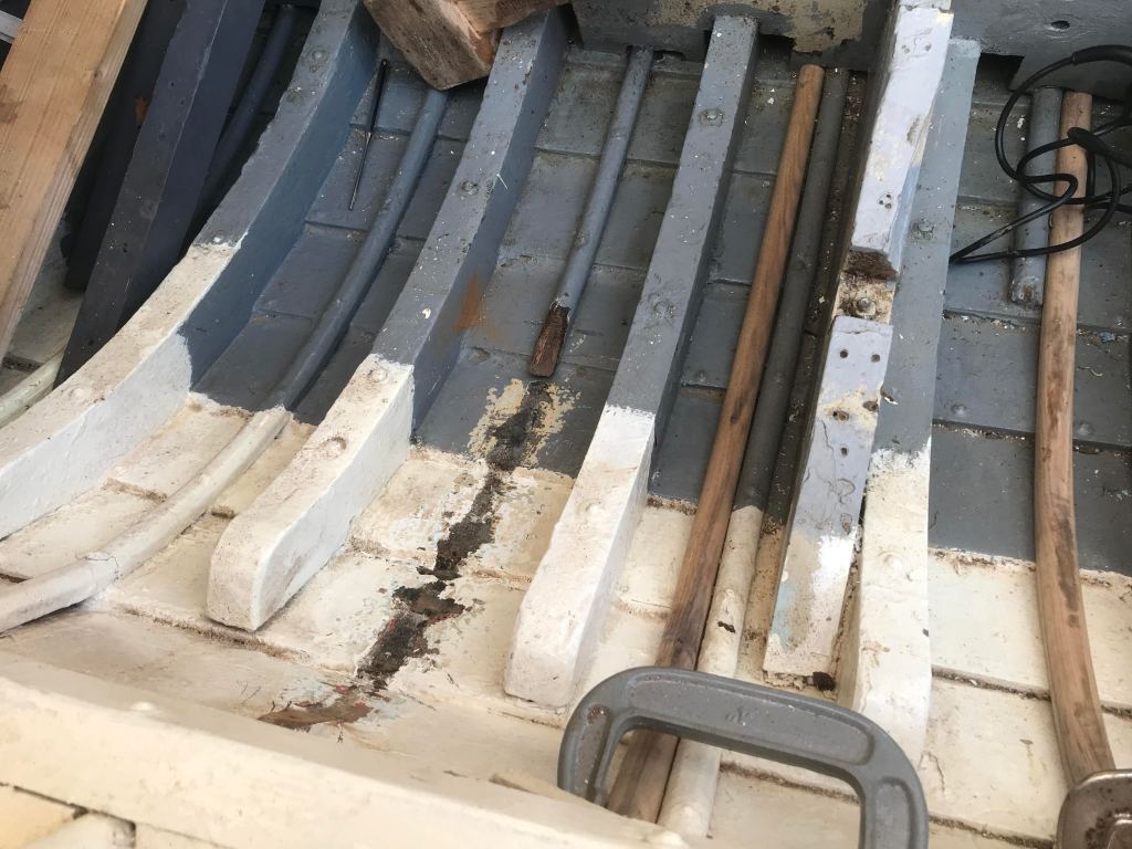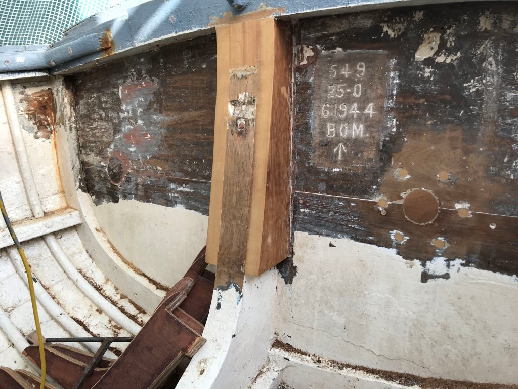 Inside the boat the most obvious problem were numerous broken frames (ribs) – mostly at the turn-of-the bilge amidships along the land that coincided with the tops of the large sawn frames that the boat is fitted with.
