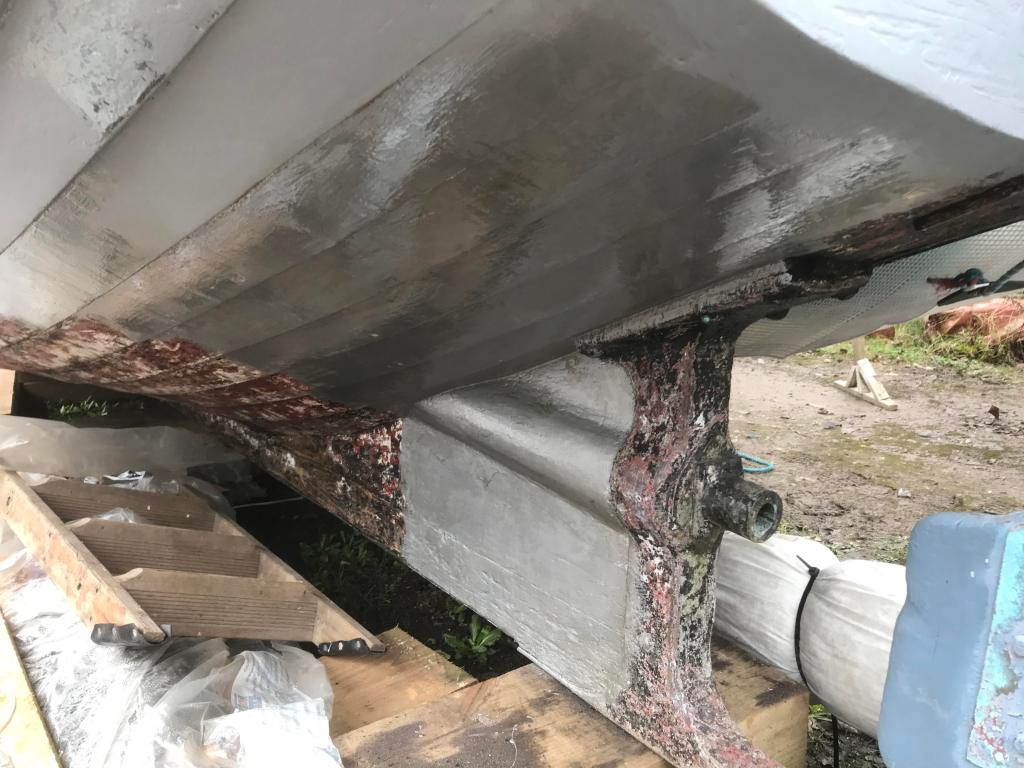 With these few repairs done a couple of coats of primer were applied to the bottom of the boat and the new bits of timber and plugged areas.