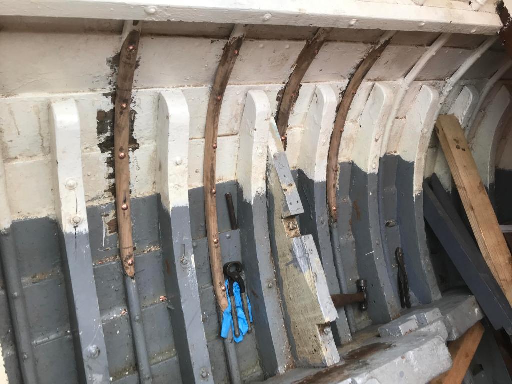 All the port-side frames done we moved over and mended a similar number on her starboard side.