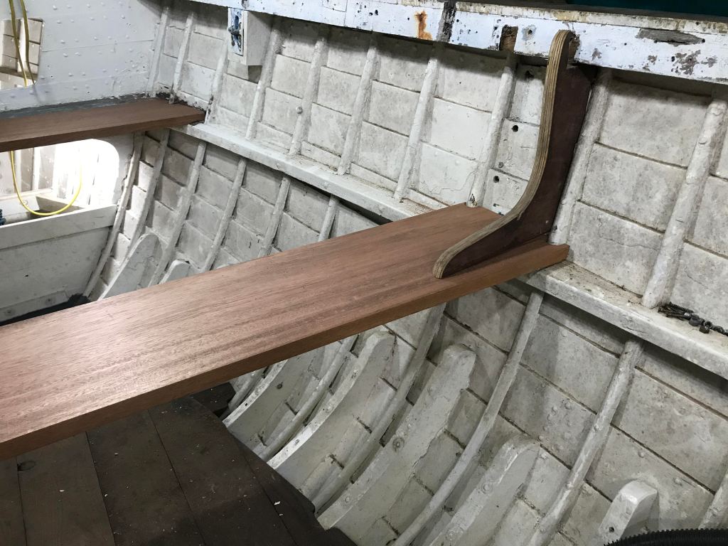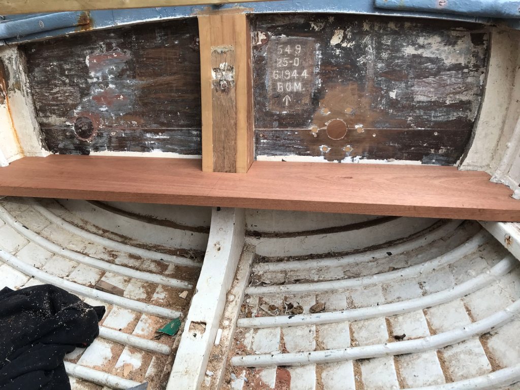 Moving back inside the boat we had some fundamental improvements to make, namely repair of her sternpost where it had been cut through for some form of wheel steering tiller arrangement, the fitting of new thwarts to replace the badly fitted and wrongly sized baulks of softwood she had when I got her, and to replace the midships watertight bulkhead under the thwart, just ahead of the engine.