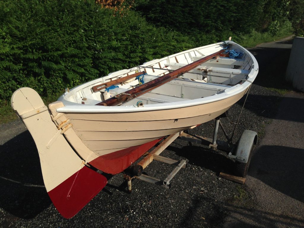 ‘Corianne’ came to me unnamed as she was found abandoned in a boatyard in Worcester in the mid 1980s. My father, who then owned a Shetland ‘Foureen’ called ‘Ilalla’ and who loved double-ended boats, encouraged me to enquire after her and I purchased her off the boatyard owner for the value of the trailer she was on. I did learn that she had possibly been one of a pair of identical boats used by youngsters (Sea Cadets?) on Lake Windermere before being sold and brought to Worcester. Her possible use as a training boat is strengthened by the fact that she has neatly constructed buoyancy compartments under each thwart and bow and stern decks. She is about 15ft long, overall, with a beam of 5ft and weighs about 225lbs (250lbs with gear stowed).