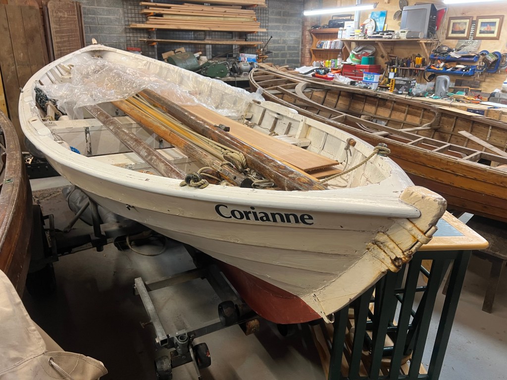 So, we had quite a busy season taking ‘Corianne’ to new places and exploring. She’s not the sort of dinghy one could easily camp on board; she needs over a foot of water to float and cants right over when dried-out but she’s fast and seaworthy for her size. Now, during my ownership she had a few replacement frames and a couple of coats of paint but during 2024 it became apparent that she really is in need of a refit; she has leaks that never properly take up and her interior paintwork is getting very flaky. So, at the end of 2024 she has come into my workshop until I have finished a couple of other projects and I can devote some time to her care that she deserves after nearly forty years in my hands.