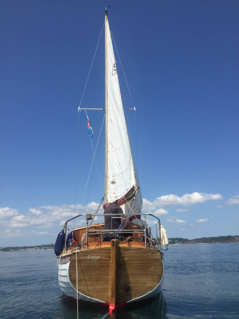 ‘Enfys’ is a Finesse 24 class auxiliary sailing yacht with external ballast keel, drop centreplate and bilge keels. She was designed and built by Alan F. Platt at his yard in Thundersley, Benfleet, Essex, UK. She is masthead sloop-rigged with burmudian mainsail and genoa jib on a rotary headstay.